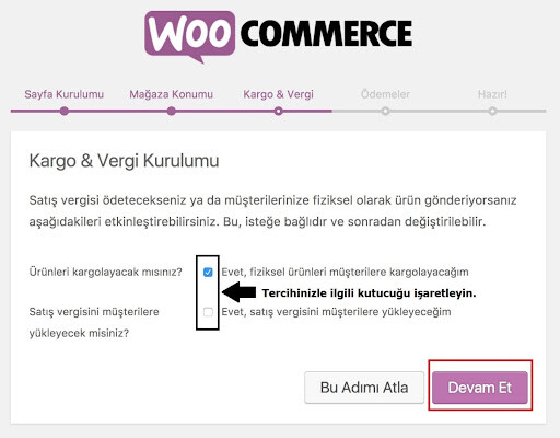 4. “Kargo & Vergi Kurulumu” tercihinizi seçin ve “Devam Et” butonuna tıklayın.